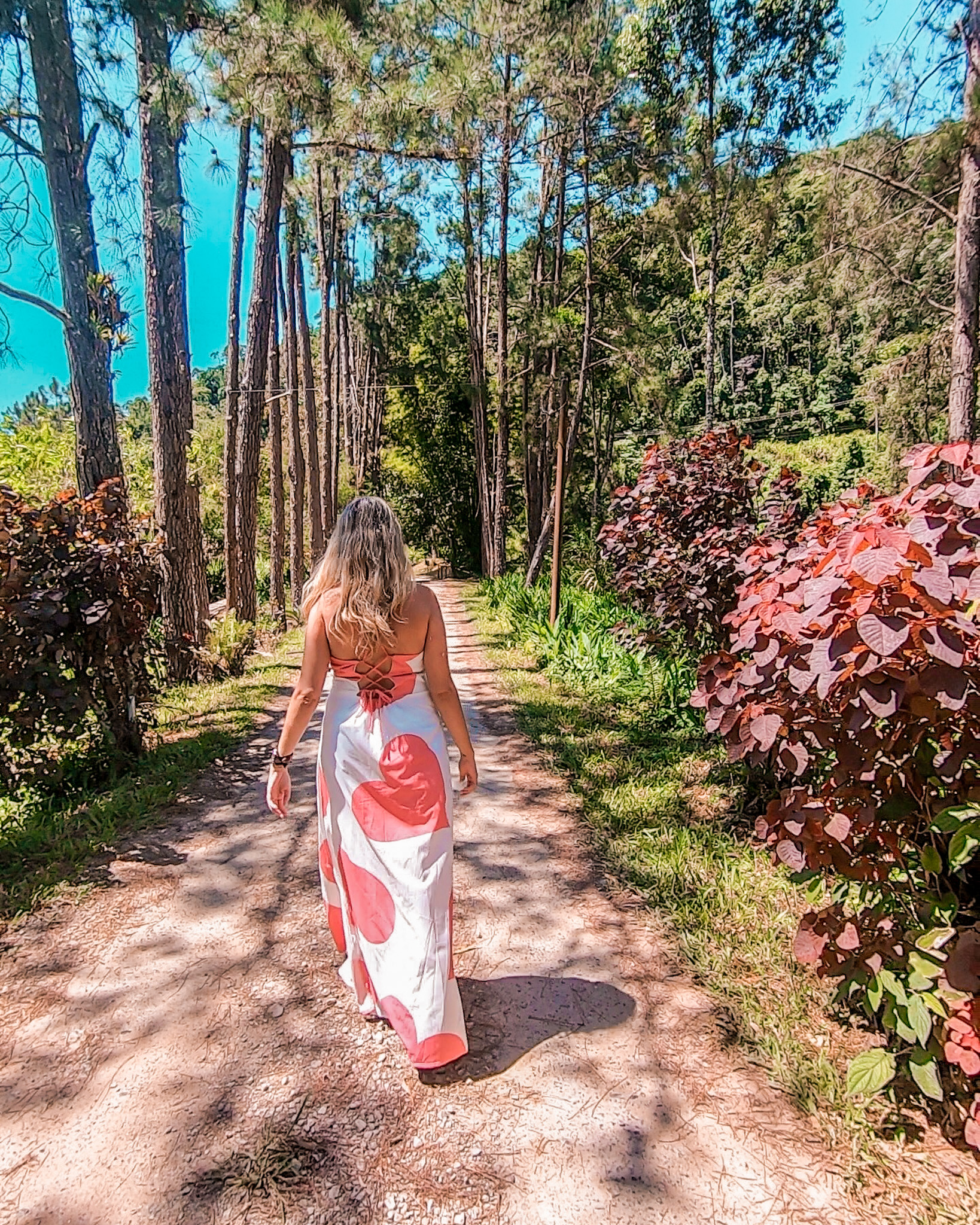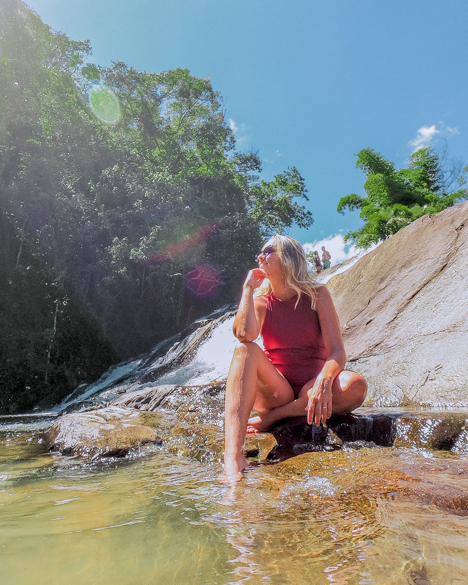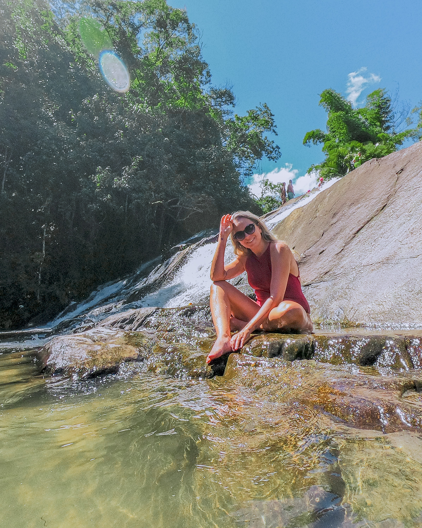 Depois de 20 minutos de caminhada e após atravessarmos mais um riozinho, chegamos até as margens das três quedas. A área boa para banho é acessada por uma pequena trilha, com uma matinha fechada, mas bem tranquila.
