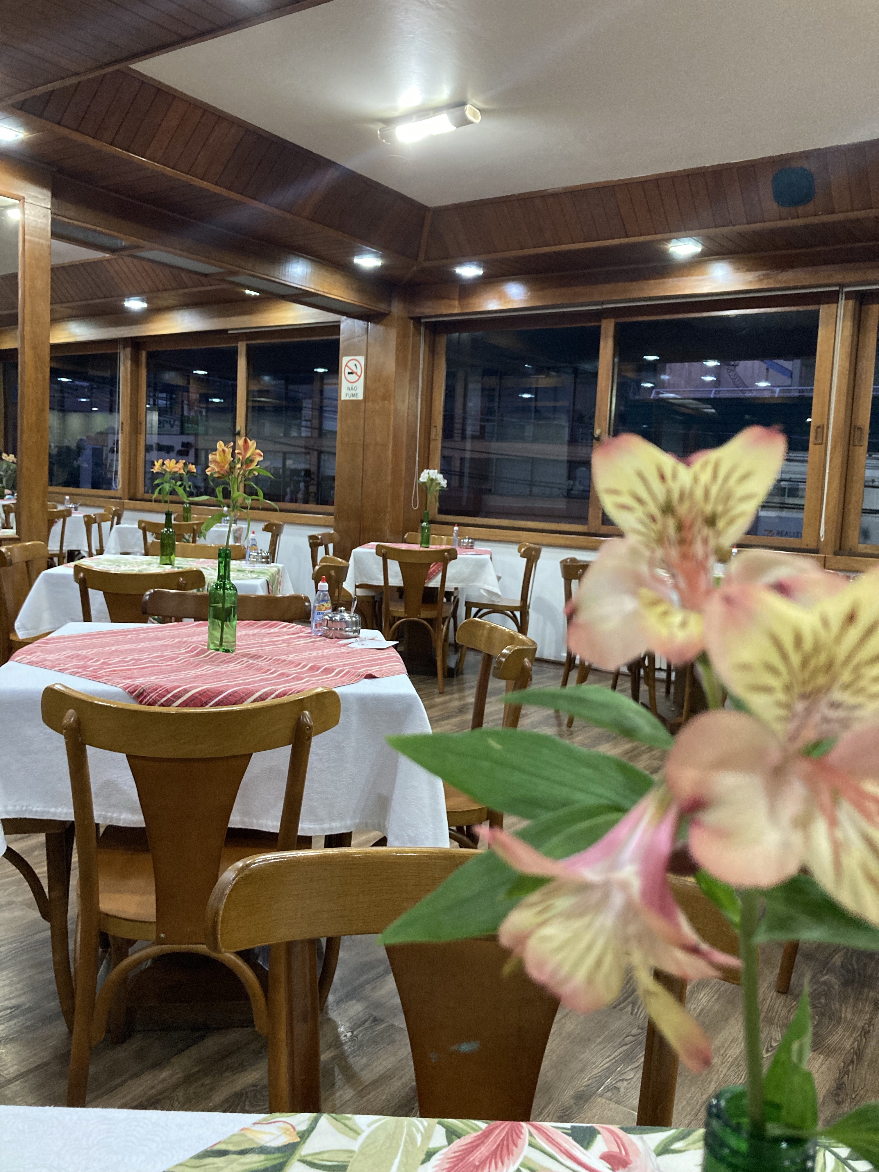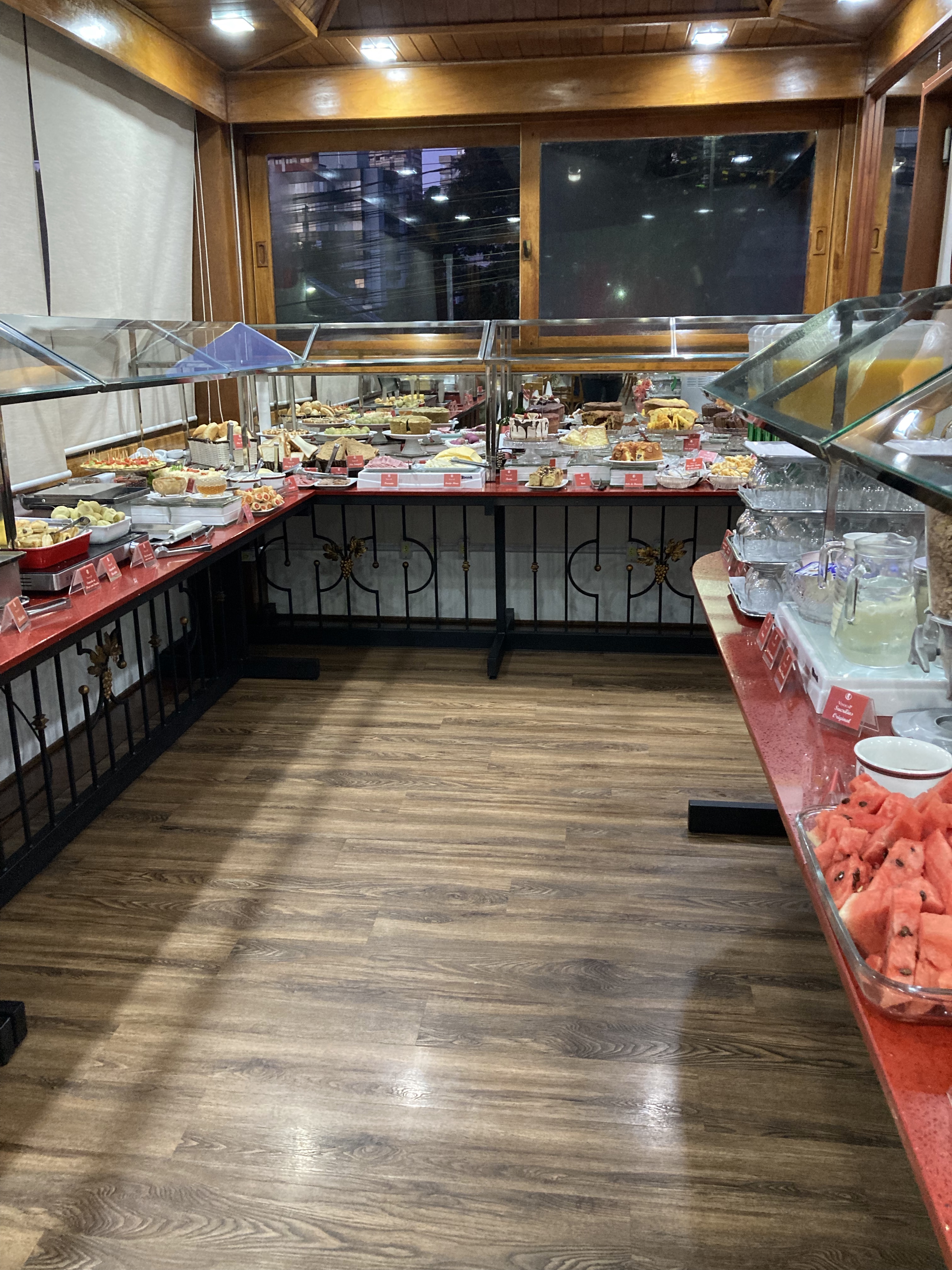 O cardápio oferecido no almoço, com massas, carnes, saladas e acompanhamentos como fortaia, polenta brustolada e queijo à milanesa é diferente do menu noturno.