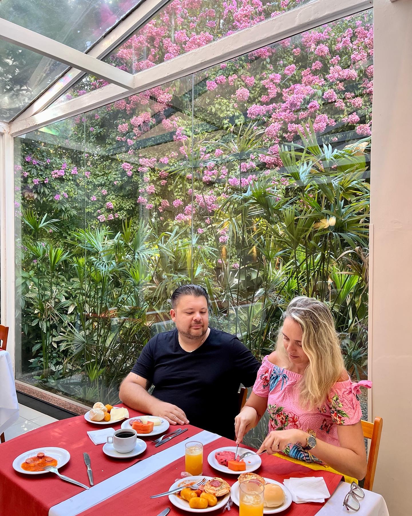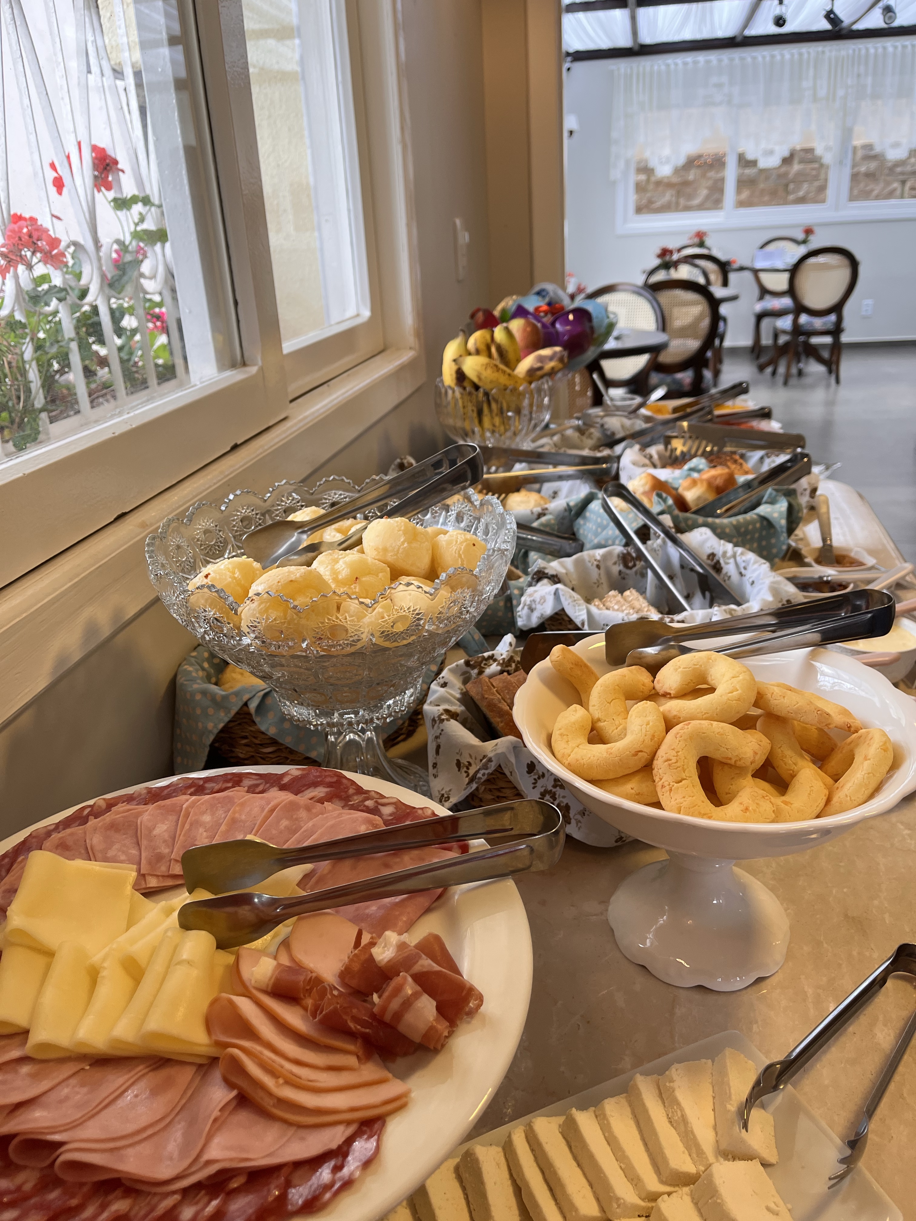 O café da manhã do hotel é extraordinário, servido em um ambiente com uma magnífica decoração, com produtos frescos e alguns doces, sucos e bolos feitos com maçã.