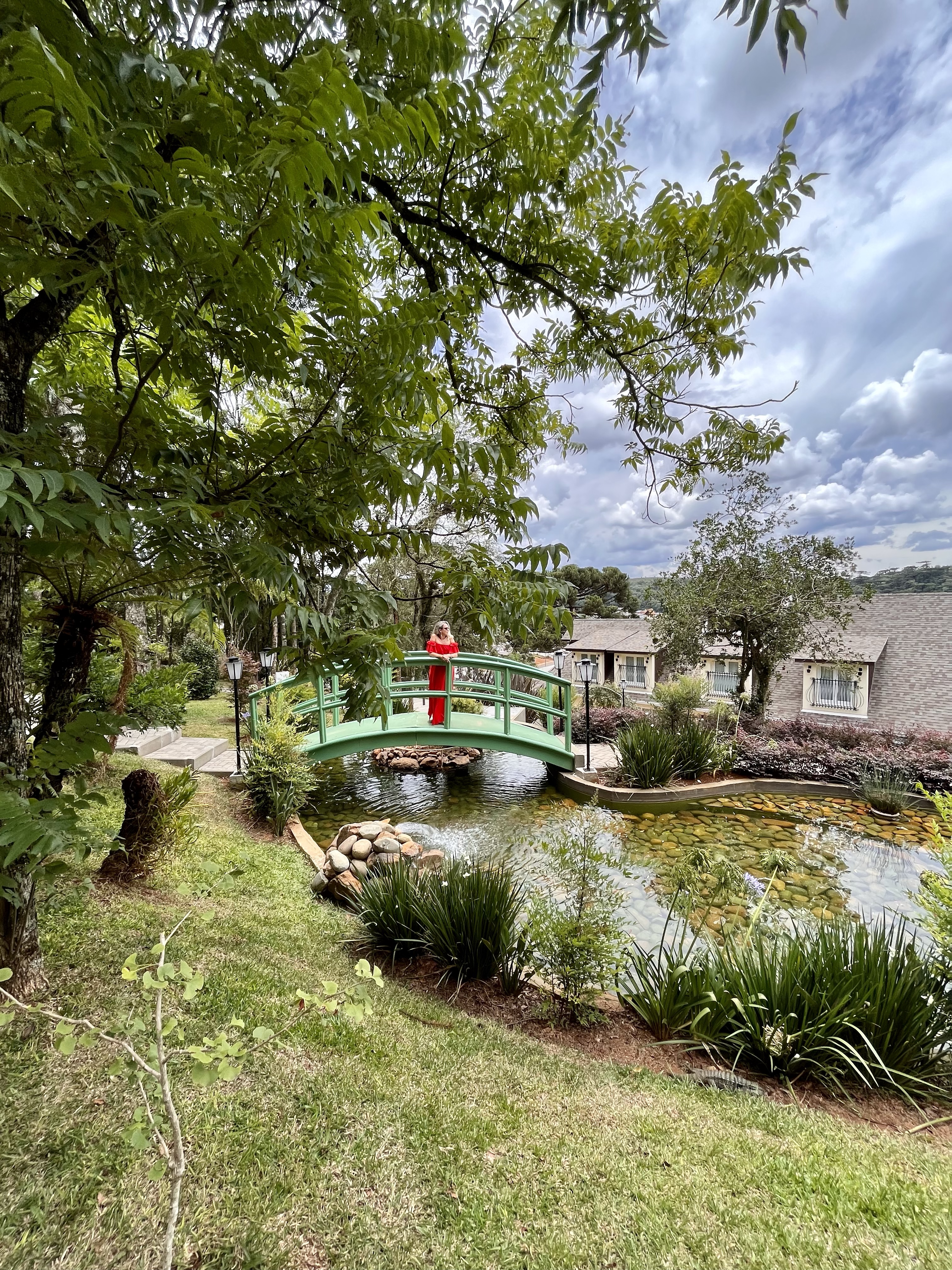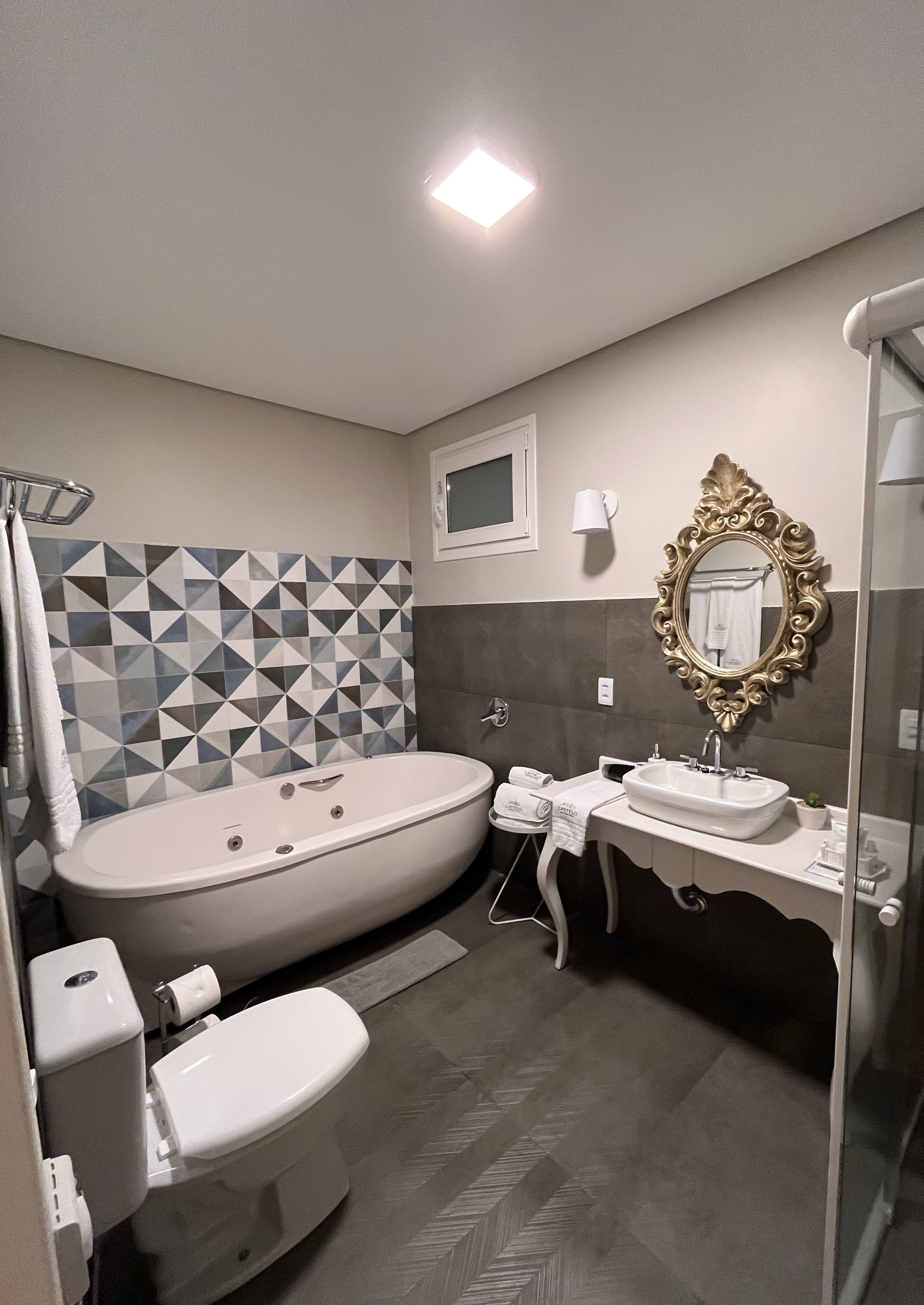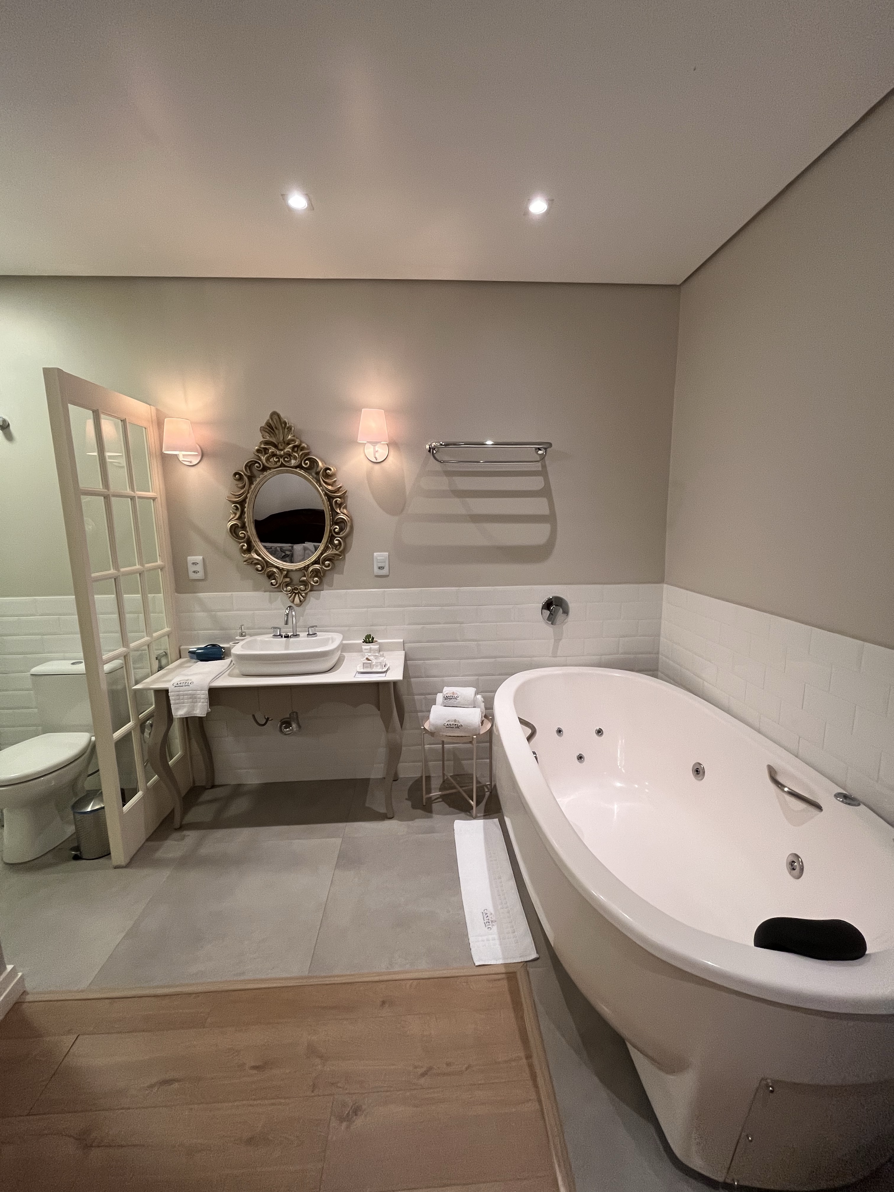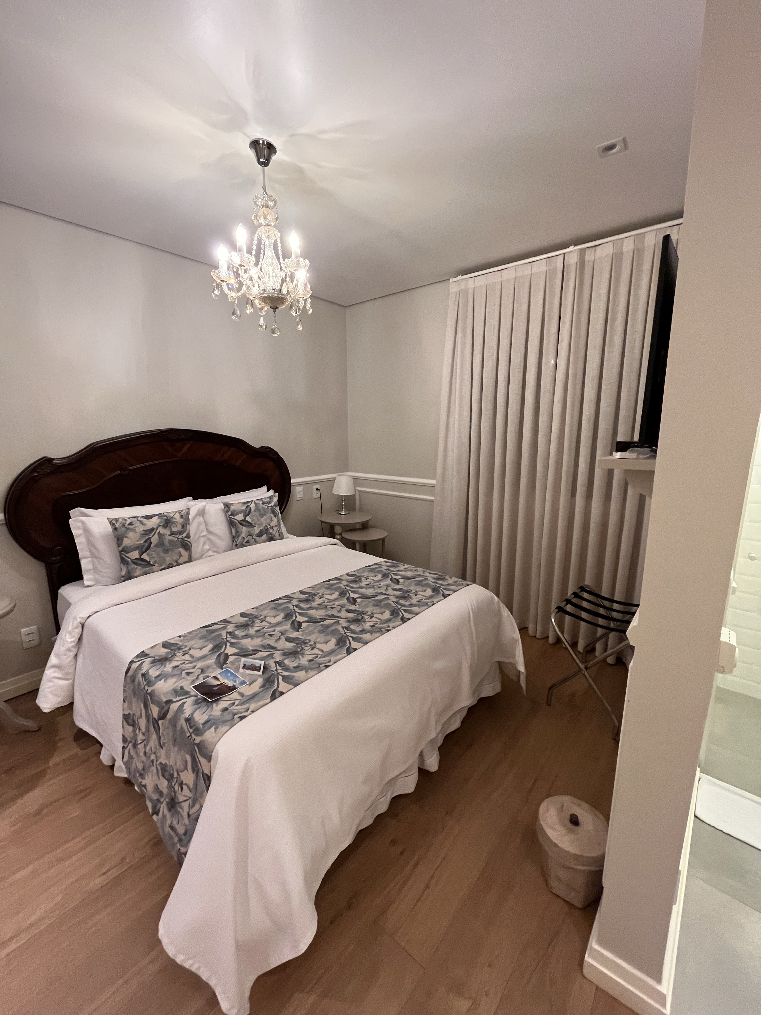 O hotel ainda dispõe de piscina aquecida com hidromassagem, espaço gourmet, adega, extensa área verde com jardins encantadores e réplicas históricas.