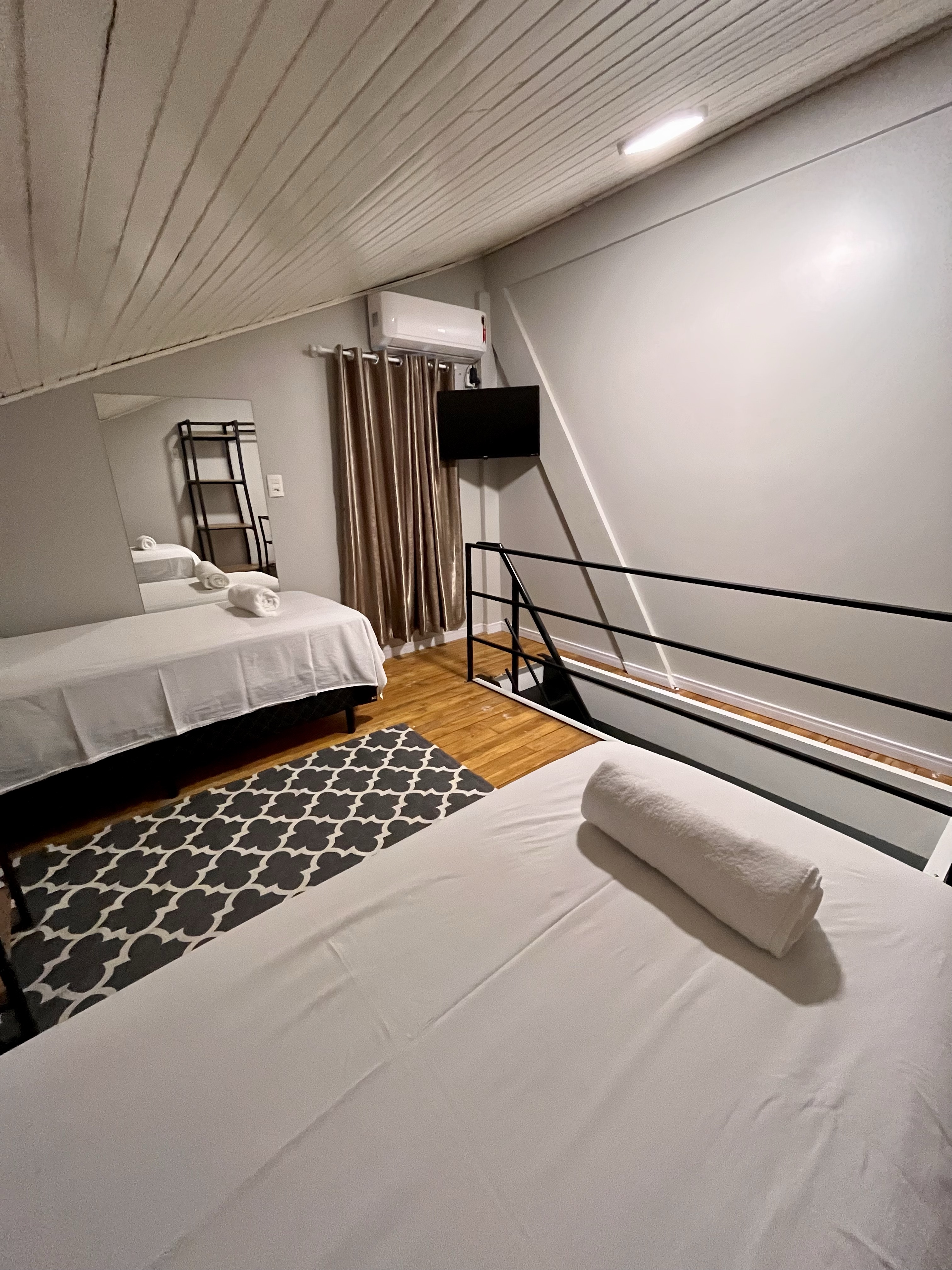 Os apartamentos possuem cama box, ar-condicionado e TV via satélite, além de ser um quarto inteligente, onde você interage com um Google Home que acende a luz, liga o som e regula o ar pelo comando de voz.